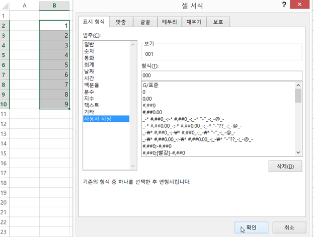 3) [형식]에 ‘000’을 입력합니다. 확인을 클릭합니다.