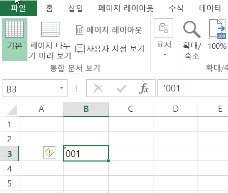 다음과 같은 방법을 사용하면 ‘001’이 문자처럼 인식되어 그대로 표시됩니다.